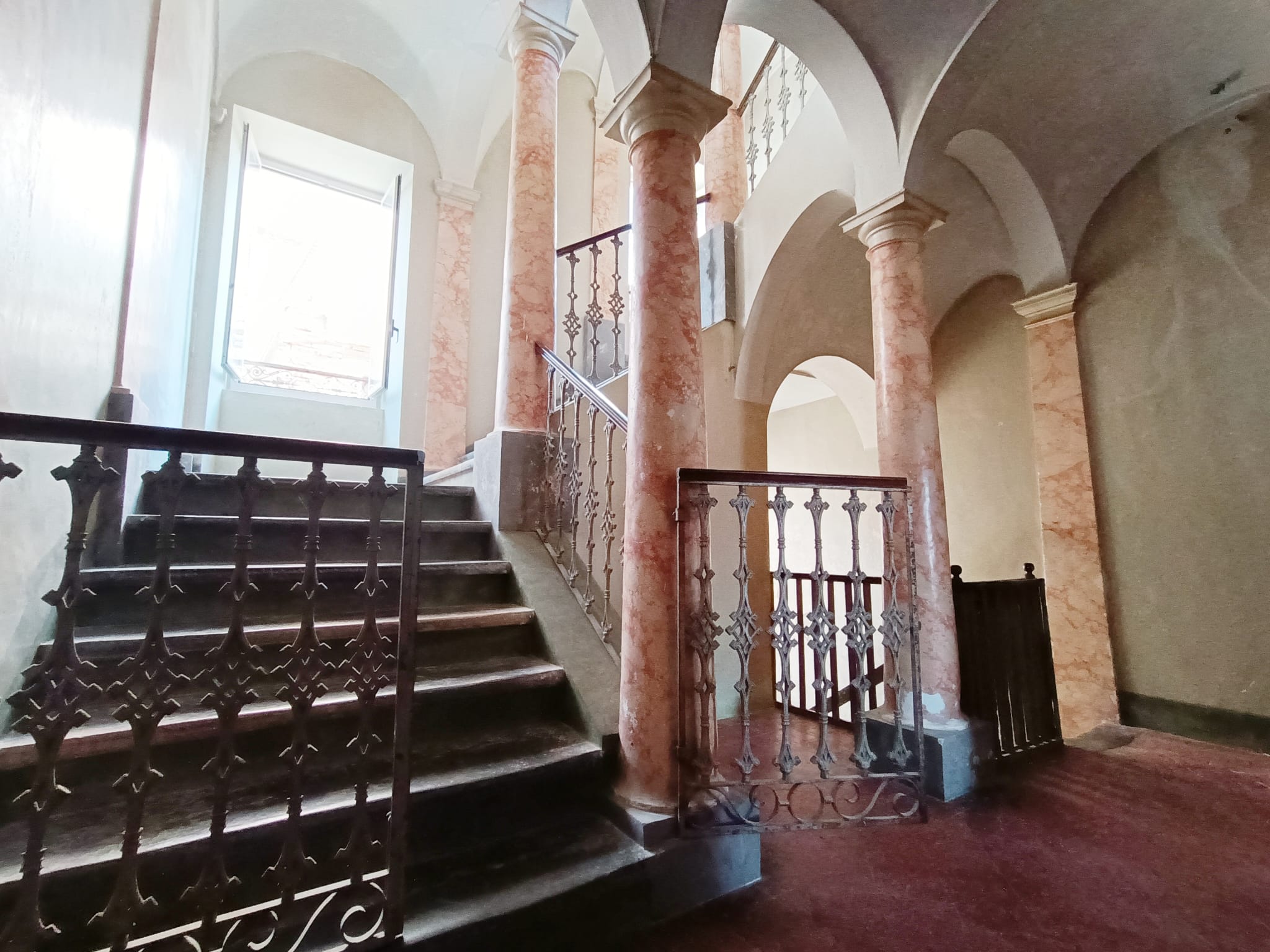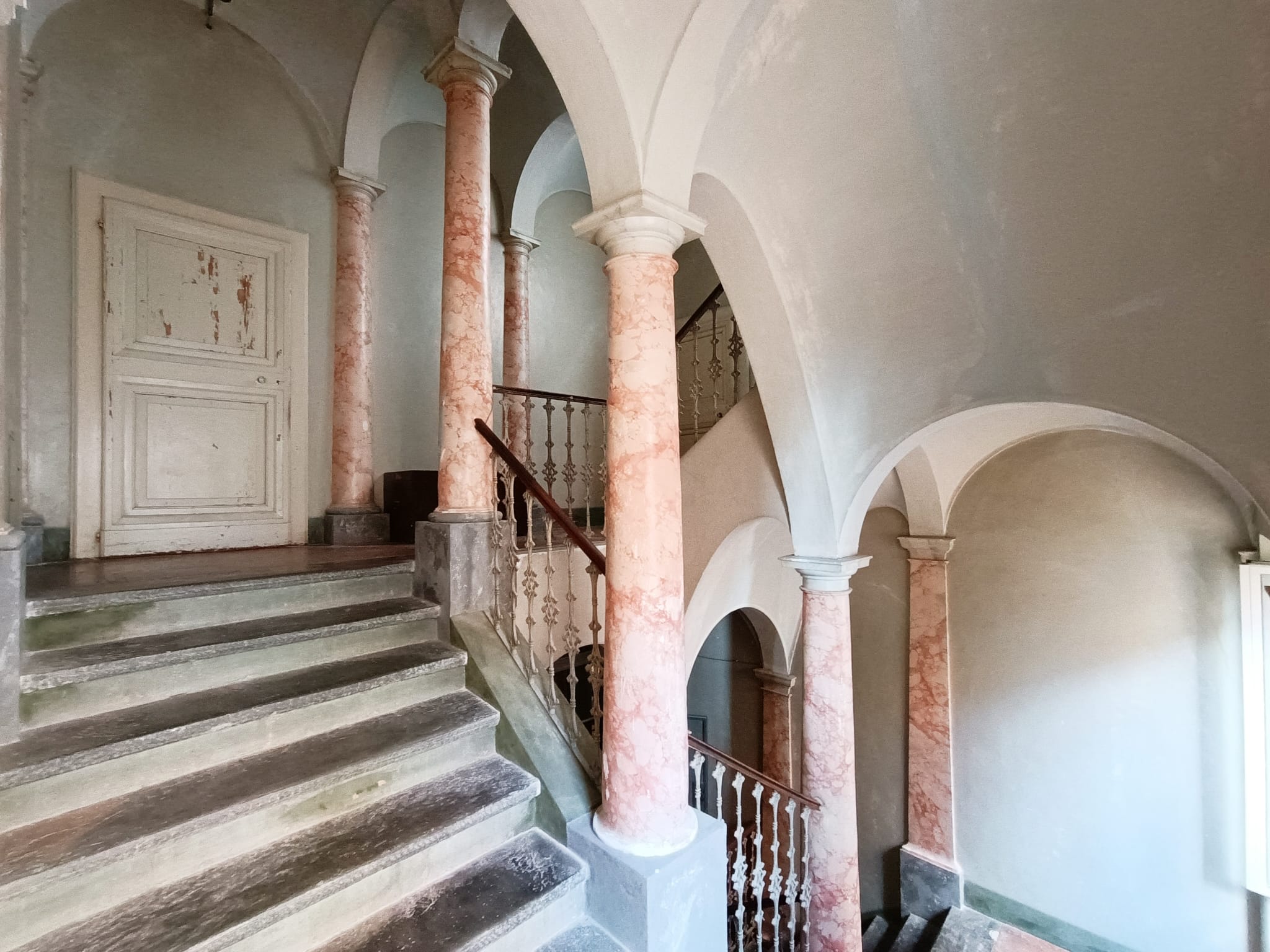 Di particolare rilievo è lo scalone principale, di notevoli dimensioni, sorretto da colonne in ordine tuscanico. Esso è il risultato di interventi settecenteschi attribuiti a Pietro Augustoni, architetto che a Massignano progettò anche la chiesa di San Giacomo Maggiore. Ulteriori modifiche agli interni furono realizzate nel corso dell’Ottocento.